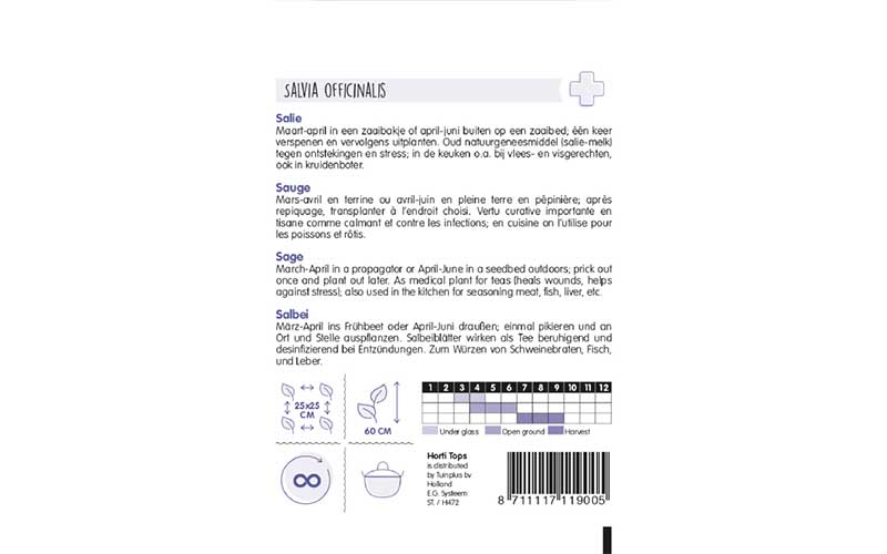 Sage (Salvia officinalis) is a versatile herb widely used in Mediterranean cuisine. Growing up to 80 cm tall, its thick, grey, and aromatic leaves make it an excellent addition to your kitchen garden. Like rosemary, sage is wintergreen, providing year-round ornamental appeal. In early summer sage gives you beautiful purple flowers.