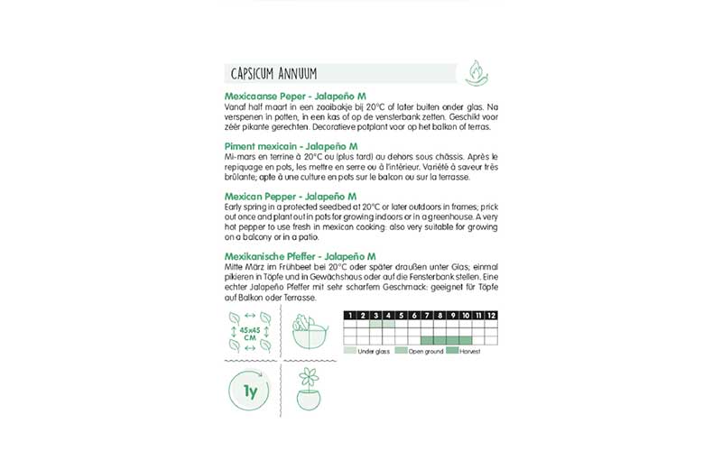 Add some heat to your garden and kitchen with the Jalapeño M, a favorite among hot pepper enthusiasts. This variety is known for its large, thick peppers measuring 8 cm long and 2 cm wide with a blunt end.