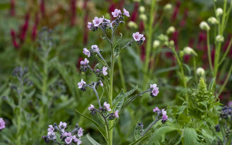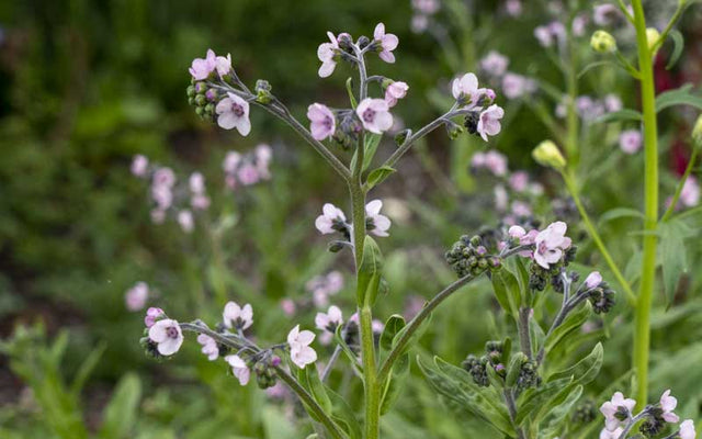 Verschönern Sie Ihren Garten mit Samen der Chinesischen Vergissmeinnicht-Rose (Cynoglossum amabile). Diese großen, zartrosa Blüten blühen in Büscheln und ziehen Bienen und andere Bestäuber an.