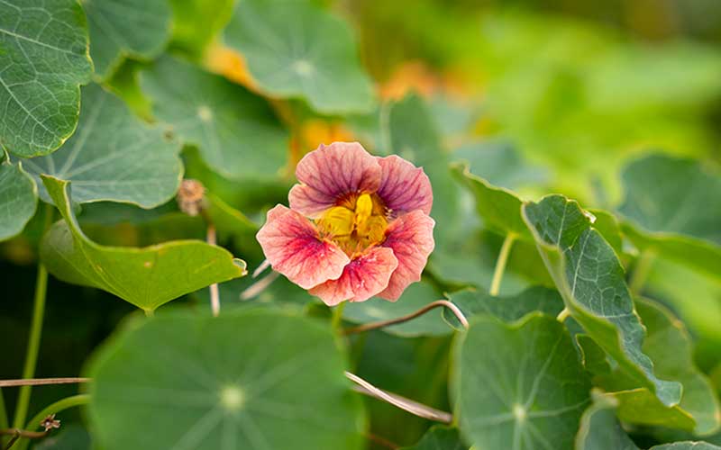 Erleben Sie die Schönheit der Kapuzinerkresse Tropaeolum Ladybird Rose. Mit atemberaubendem dunklem Laub und rauchig-himbeerfarbenen Blüten ist diese nicht kletternde Sorte perfekt für Töpfe, Balkone oder als Opferpflanze in Ihrem Gemüsebeet.