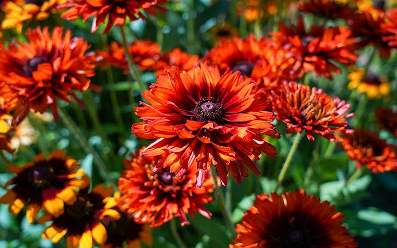 Rudbeckia hirta Cherokee Sunset hat atemberaubende gefüllte, volle karamellfarbene Blüten mit dunkelbrauner Mitte. Diese einzigartige und langblühende Pflanze ist eine fantastische Ergänzung für jeden Garten. Die wunderschönen dunklen Blüten mit einem Durchmesser von bis zu 12 Zentimetern eignen sich perfekt für spätsommerliche Arrangements und sind langlebige Schnittblumen.