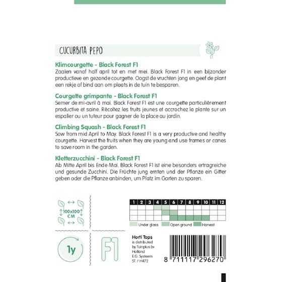 Erleben Sie die Freude am Gärtnern mit der Kletterzucchini Black Forest, einer Sorte, die von Gärtnern wegen ihrer außergewöhnlichen Produktivität und ihres reichen Geschmacks geschätzt wird. Diese Kletterzucchini ist ein wahres Kraftpaket, das während der langen Sommertage mehrere Früchte pro Woche hervorbringt. Freunde und Familie werden von der üppigen Ernte dieser Pflanze begeistert sein, was sie zu einem Muss in Ihrem Garten macht.
