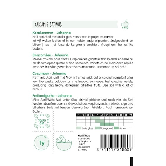 Les concombres Johanna sont une variété facile à cultiver connue pour sa croissance rapide et son goût non amer. Idéals pour la culture en extérieur et en serre, ces concombres prospèrent dans un sol riche et fournissent une récolte abondante tout au long des mois d’été.