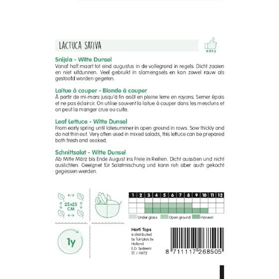 Witte Dunsel est une variété de laitue frisée polyvalente et facile à cultiver, parfaite à ajouter à vos mélanges de salades. Ses feuilles douces et tendres peuvent être dégustées crues ou en compote, ce qui en fait un délicieux ajout à votre jardin et à votre cuisine. Que vous soyez un jardinier chevronné ou débutant, Witte Dunsel est un excellent choix pour des récoltes constantes et délicieuses tout au long de la saison de croissance.