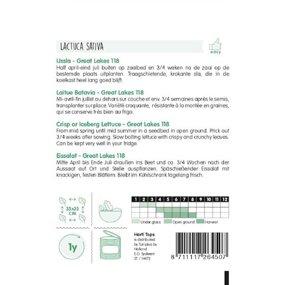 Great Lakes 118 IJsbergsla is speciaal ontwikkeld vanwege zijn schietvastheid en uitstekende bewaarmogelijkheden. Geniet van heerlijk knapperige dikbladige sla die in de koelkast lang vers blijft. Deze variëteit vormt grote, stevige kroppen, perfect voor salades.