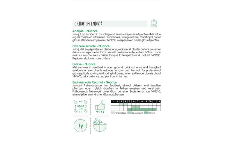 Nuance Andijvie (Cichorium endivia) biedt een heerlijke balans tussen smaak en veelzijdigheid. Met zijn licht bittere smaak behoort hij tot dezelfde familie als witlof en leent zich uitstekend voor zowel rauwe als gekookte gerechten. Van salades en aardappelpuree tot gevulde broodjes en hartige taarten: Nuance Andijvie kan uw culinaire creaties naar een hoger niveau tillen.
