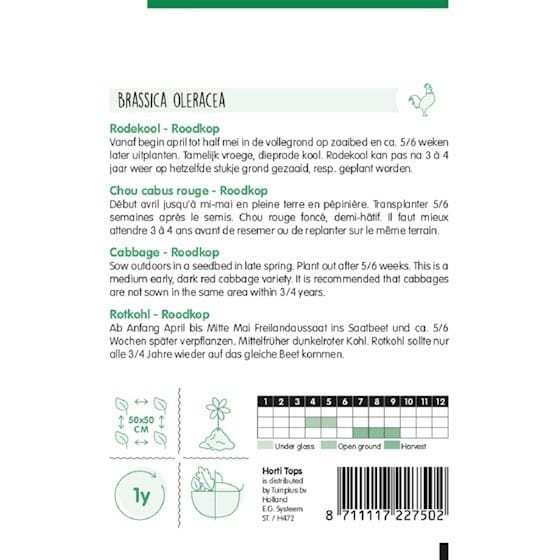Rode Kool - Roodkop is een vroege, snelgroeiende variëteit die bekend staat om zijn dieprode kleur en zachte bladeren. Deze variëteit is perfect voor tuinders die de hele zomer willen genieten van verse rode kool. Met zijn snelle groei en vroege volwassenheid is Roodkop een uitstekende keuze voor tijdige oogsten, hoewel hij niet erg geschikt is voor langdurige opslag.