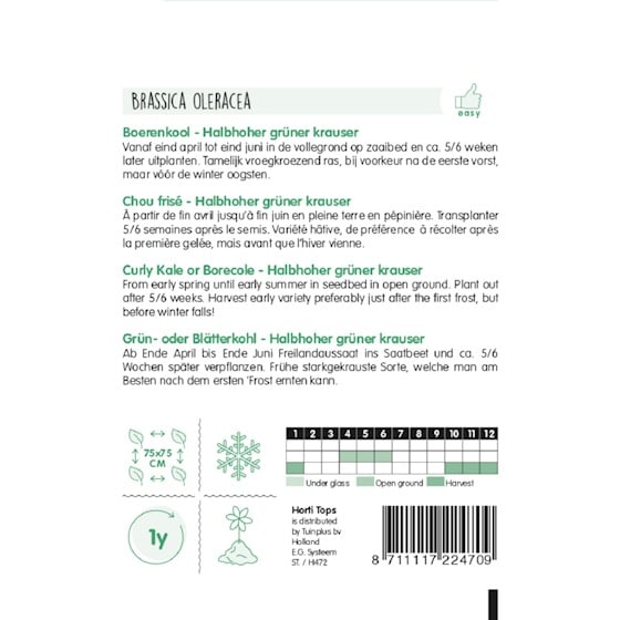 Experience the unparalleled benefits of our Kale – Medium-high fine curl (Halbhoher grüner Krauser). This fast-growing, highly productive variety is perfect for home gardens. Start sowing from the end of April to the end of June, either directly in the ground or in seed trays, and transplant about 5-6 weeks later.