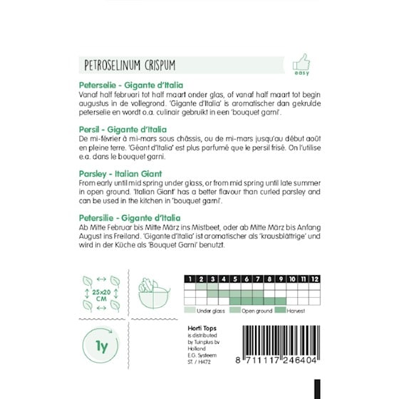 Parsley - Gigante d'Italia is a robust and aromatic variety, more flavorful than curly parsley. Ideal for culinary use, this smooth-leaved parsley is a key ingredient in 'bouquet garni' and other dishes.