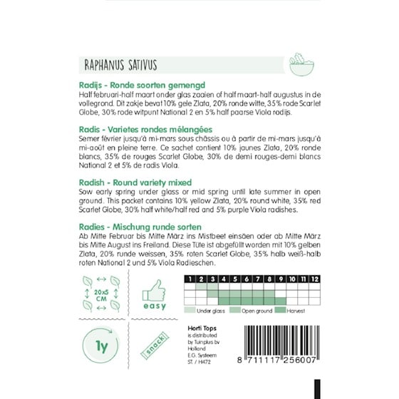 Experience a delightful mix of radish varieties with our Round Varieties Mixed pack. This diverse blend offers a range of flavors from mild to spicy, making your garden and your dishes more exciting. This mix is perfect for growing in open ground and ensures a vibrant and flavorful harvest.