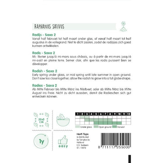 Radish - Saxa 2 is a perfect choice for gardeners looking for a fast-growing and space-efficient vegetable. Its mild flavor makes it a versatile addition to salads and other dishes. Ideal for small gardens, Saxa 2 radishes develop quickly and can be sown multiple times throughout the season for a continuous harvest.