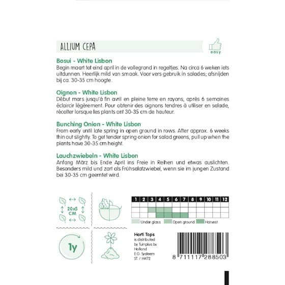 Enjoy the deliciously mild and fresh taste of White Lisbon spring onions. These onions are perfect for salads, Asian dishes, and as toppings for soups. Known for their slightly spicier flavor compared to regular onions, they are hardy to -6°C and can regrow from the base after cutting.